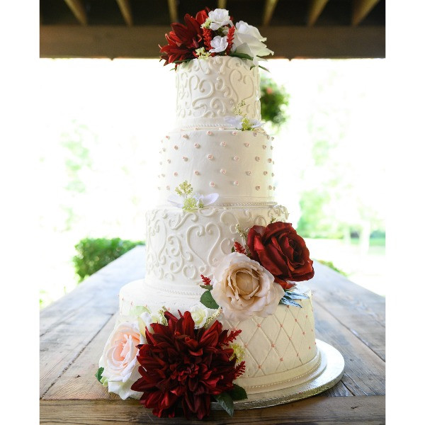 To take your presentation up a notch, you can even add decorations such as a small wedding couple figurine at the top of the tall cake, cake sparklers, satin ribbons and silk or edible flowers.