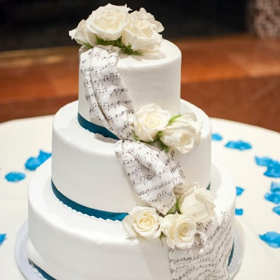 The satin ribbon on the wedding cake adds a good touch to the decoration. Choose a color that matches your theme.